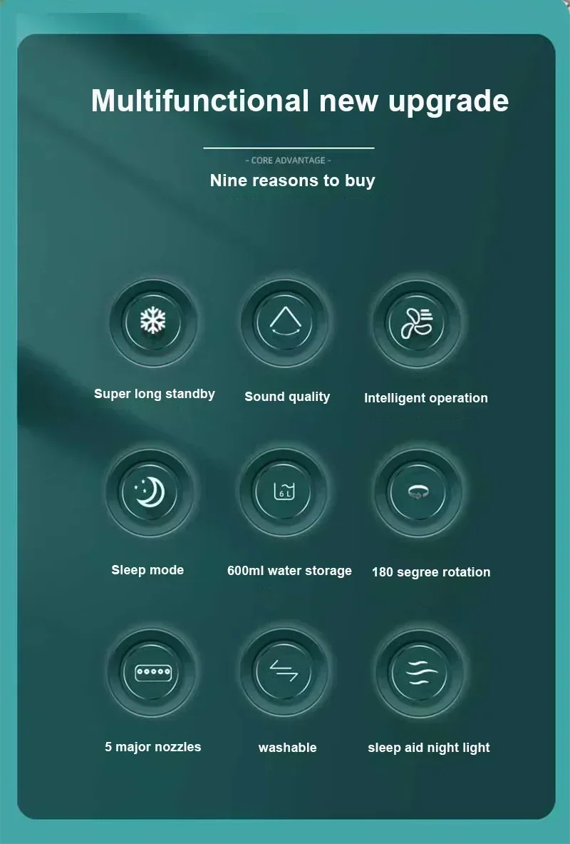 Triple Functionality: Fan, humidifier, and LED night light in one sleek unit.