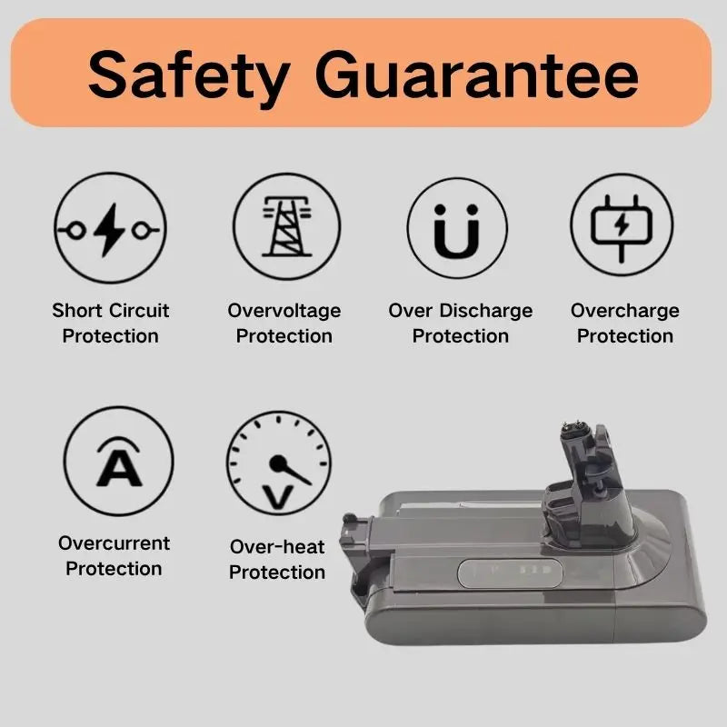 3. Intelligent Protection for Dyson V10 Battery Replacement: Grade A cells with UL-2595 and CE certified ensure fast charges and low power consumption.Built-in with intelligent chip provides over-voltage protection,over-current protection,short circuit protection,high-temperature and over-charge protection. NOTE: Cool down the battery before recharging and use.