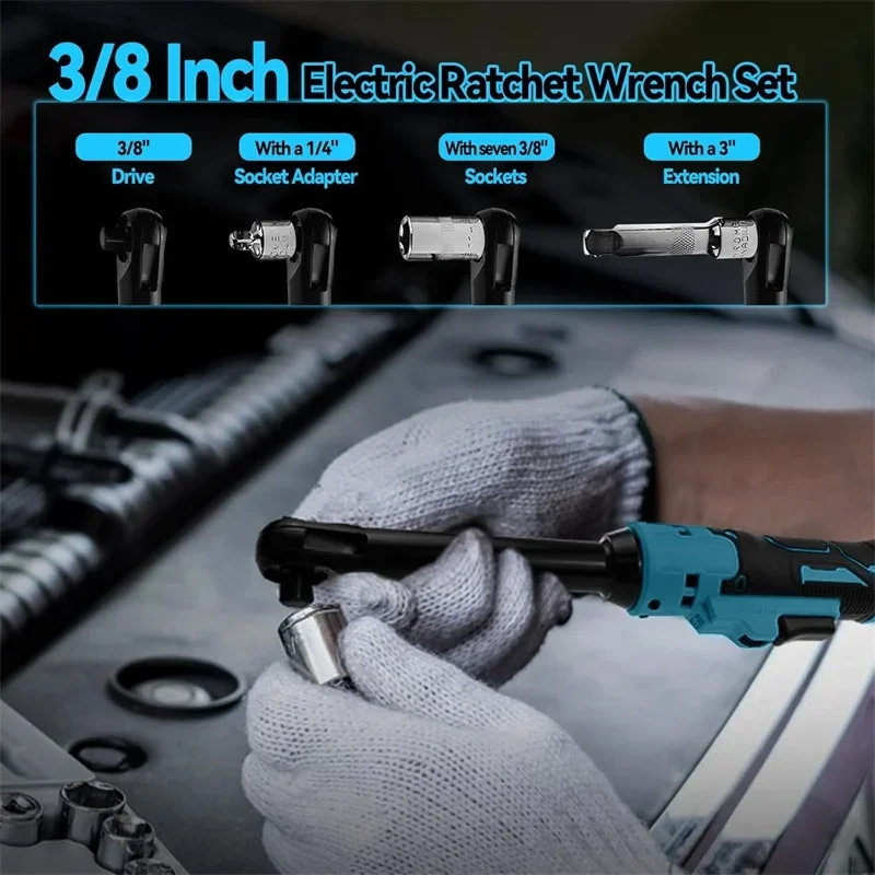 2.Efficient and powerful: This 3/8-inch cordless ratchet wrench has a torque of up to 100NM and a maximum speed of 600rpm. It is suitable for bolts or nuts of various sizes. It will become a powerful assistant in your repair toolbox and help you complete repair tasks more quickly. The package comes with 8 metric sockets (9mm/10mm/11mm/12mm/13mm/14mm/15mm/17mm), 1 extension rod (3/8" x 3"), and 1 drive adapter (3/8" to 1/4")