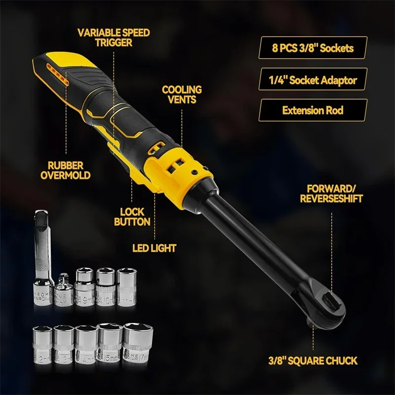 Tight spaces? No problem. This extended cordless ratchet wrench is built for tradies who need torque and reach without the tangle. Compatible with Makita, Dewalt, and Milwaukee 18V lithium-ion batteries, it delivers electric power where manual ratchets fall shortâperfect for engine bays, underbody work, and tight cabinetry installs.