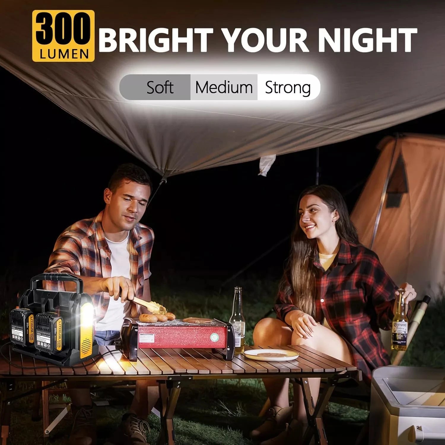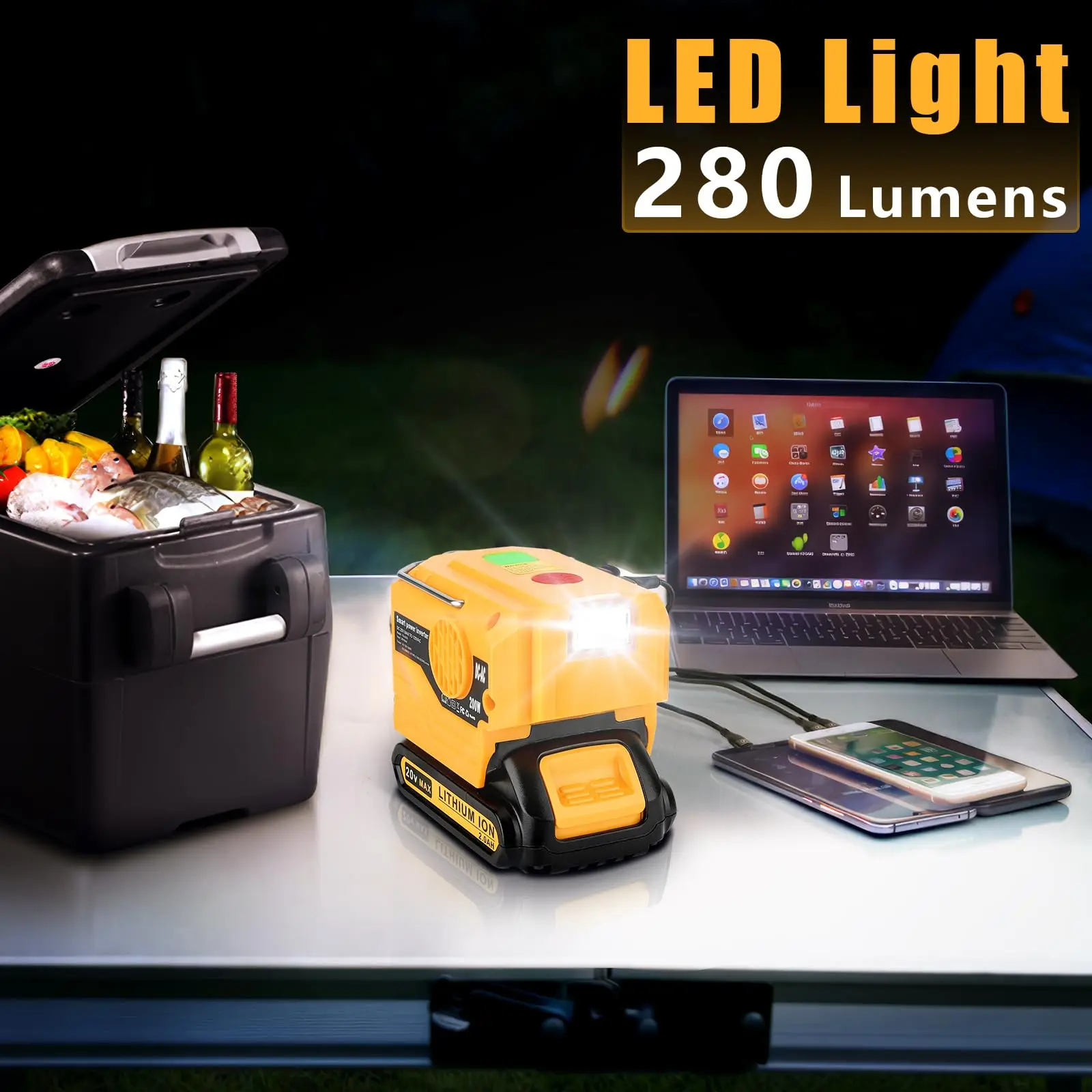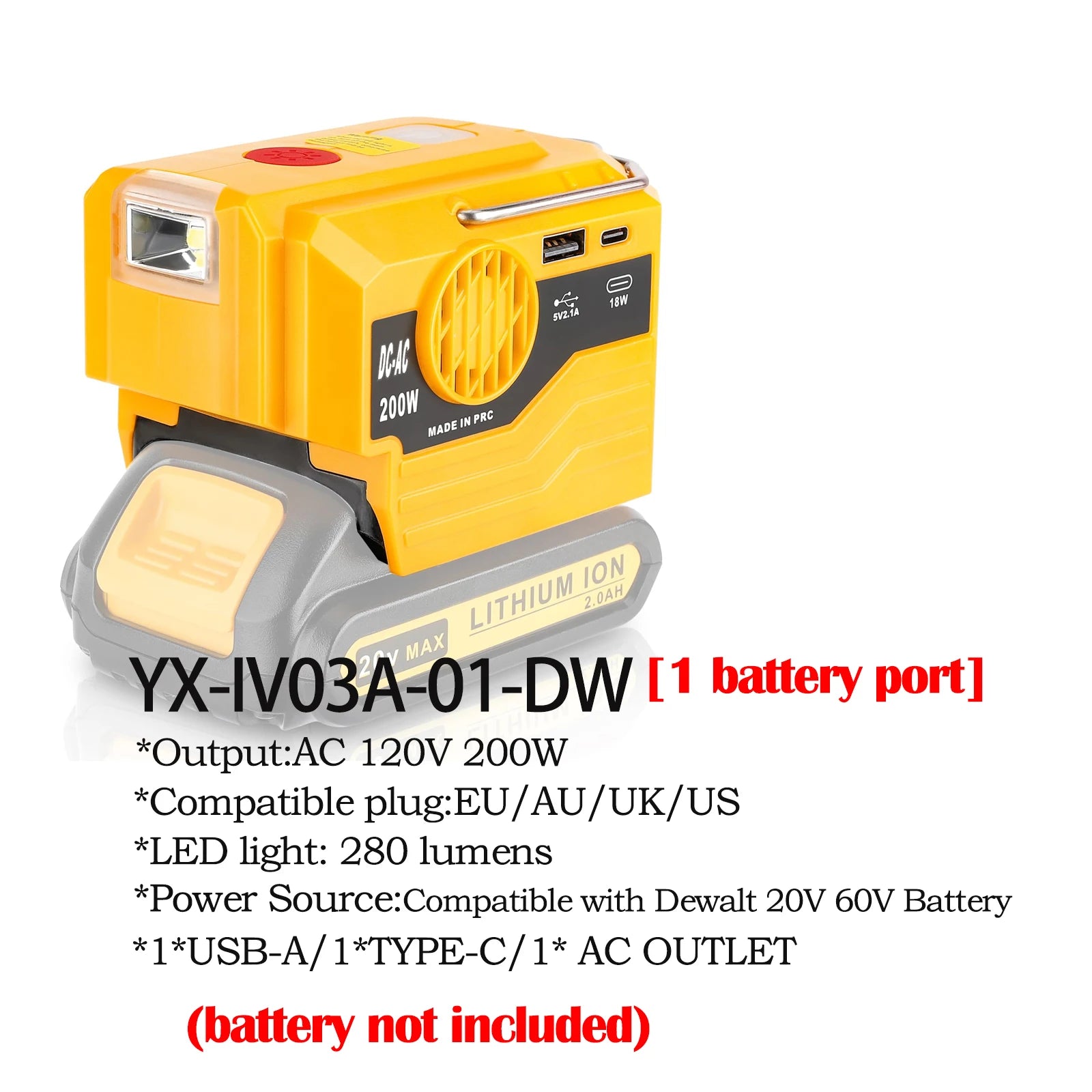 200/350W Output Portable Inverter for Dewalt 20V 60V Li-ion Battery Power Supply Source DC 20V to AC 120V/220-230V Converter for Camping Emergency with AC Outlet USB Port Type-C Port 300LM LED Light 【Battery not included】