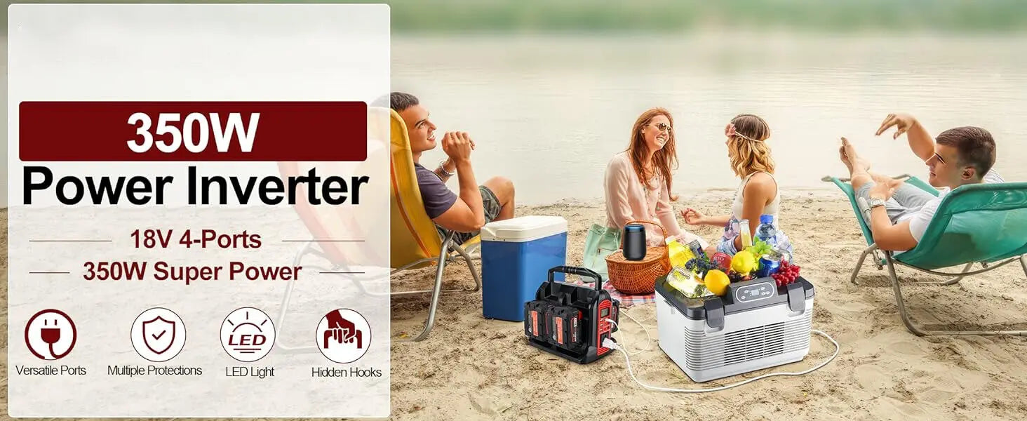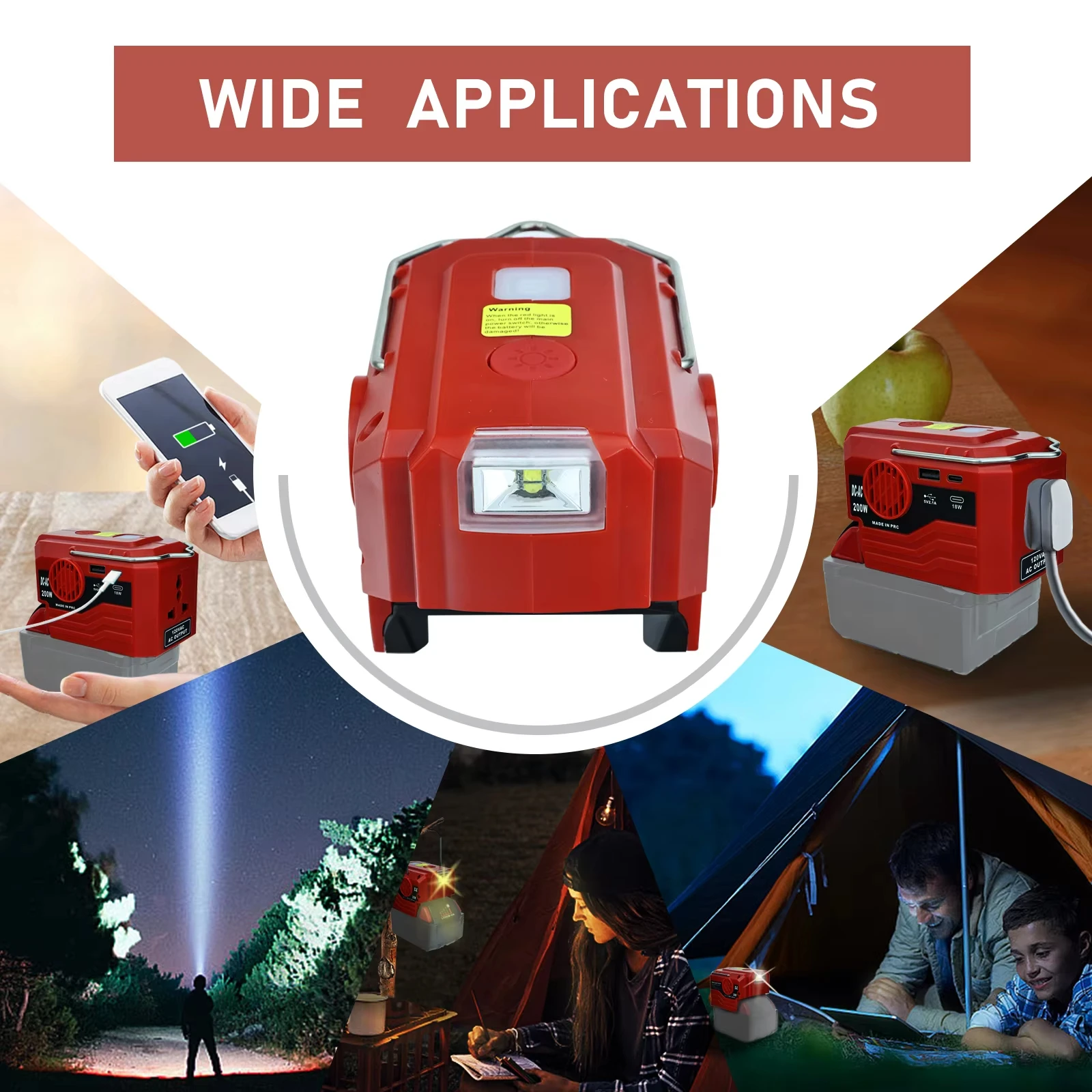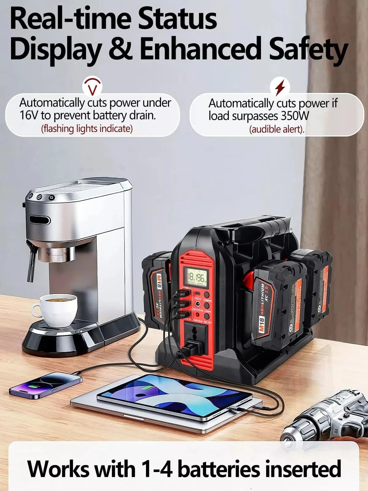 🔋 350W Power Inverter — Milwaukee M18 Compatible | 4-Port AC Output + LED Light + USB Power