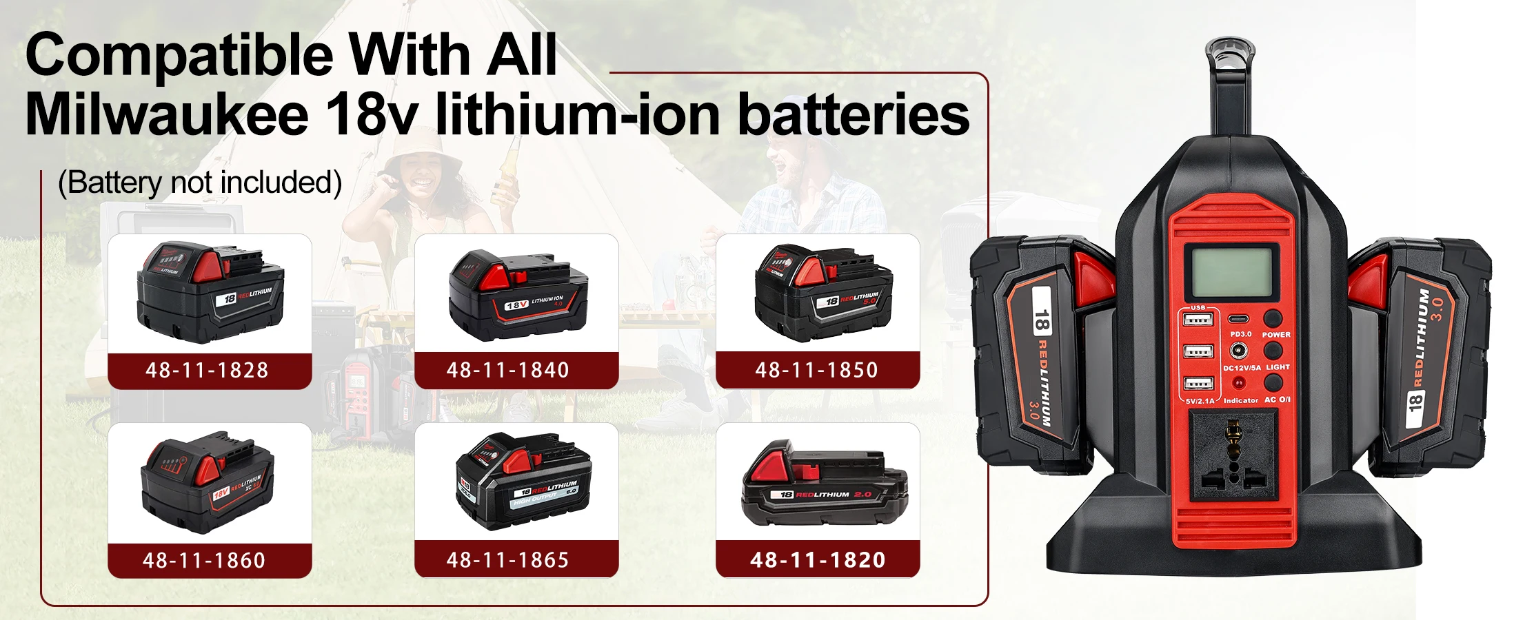Perfectly compatible with Milwaukee M18 18v lithium-ion batteries :48-11-1811 48-11-1815 48-11-1820 48-11-1822 48-11-1828 48-11-1840 48-11-1841 48-11-1850 etc.(Battery not included)