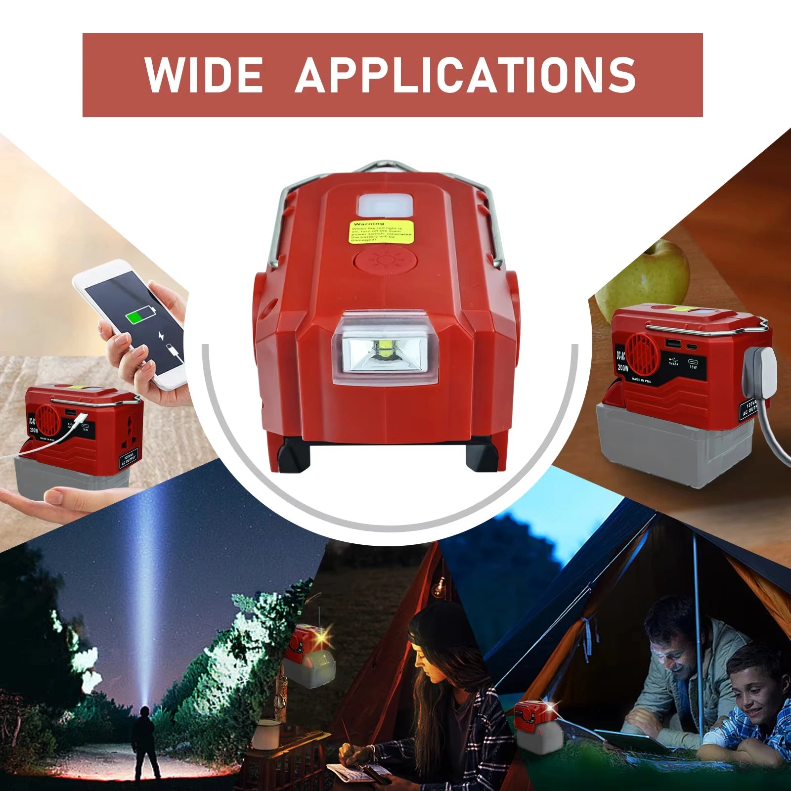 Milwaukee Compatible 18V JV 350W Power Supply Inverter For Milwaukee M18 18V Battery 4-Port to AC 110-120V/220-230V 300LM LED Light 4 USB Output for Outdoor