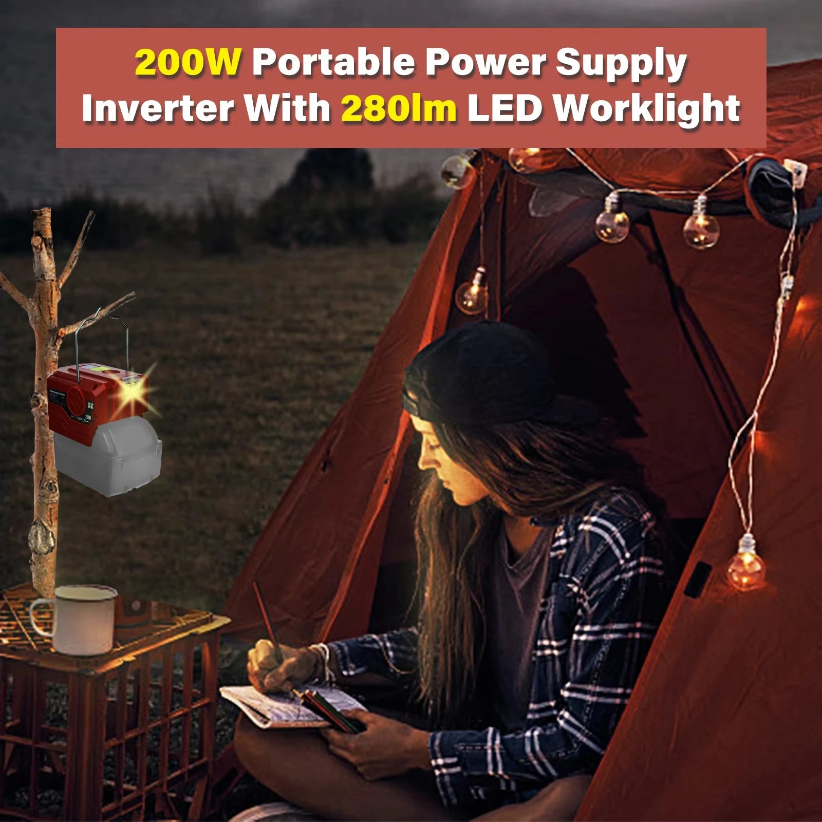 200/350W Power Supply Inverter For Milwaukee M18 18V Battery 2/4-Ports DC 18V to AC 110-120V/220-230V 300LM LED Light for Outdoors Camping Travel Emergency With 3 USB/1 DC/1 TYPE-C Output【Battery not included】