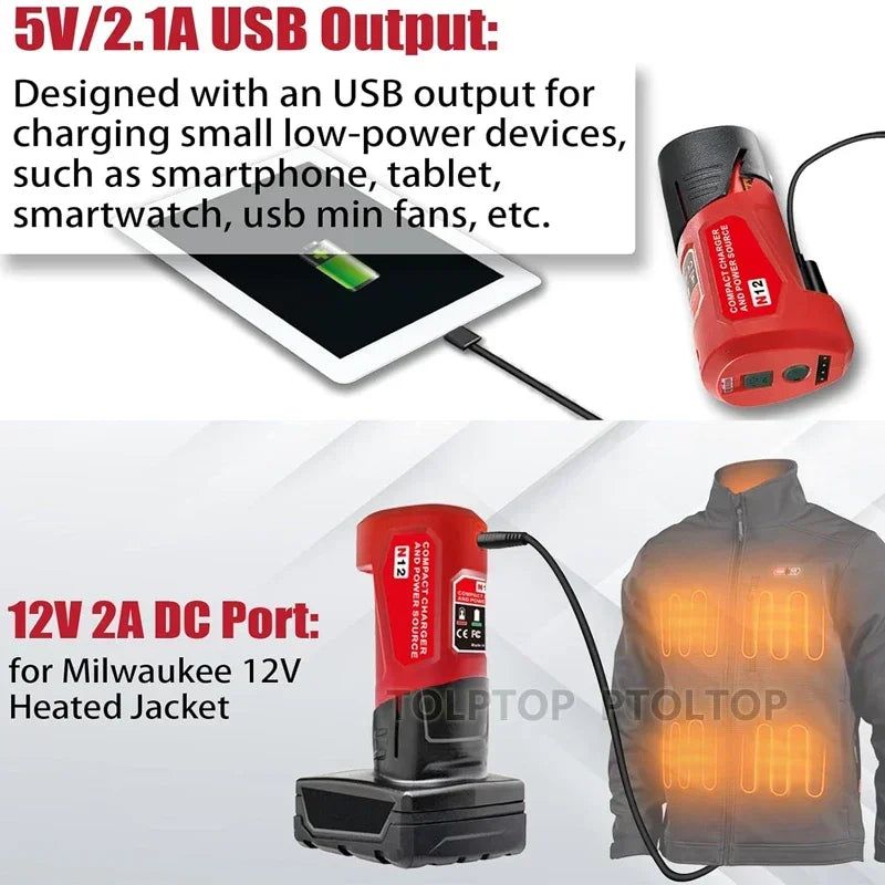 [ Compatible For Milwaukee 10.8V/12V batteries ] USB power source Adapter for Milwaukee 10.8V/12V cordless power tool battery packs 48-11-2401, 48-11-2420, 48-11-2440, 48-11-2430, 48-11-2460, 48-11-2402, the power source provides convenient portable charging For Milwaukee 10.8V/12V batteries and USB devices. (M-12 Jacket Battery Adapter Only.Not Included battery)