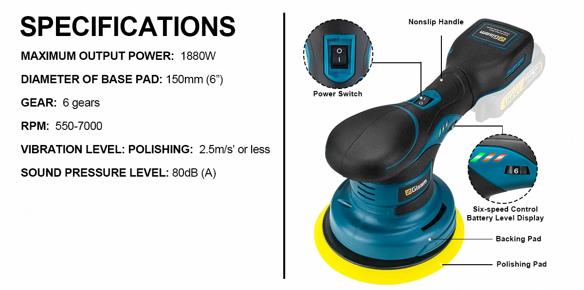 Makita-Compatible 18V JV Gisam Brushless Cordless Car Polisher – 6-Speed Adjustable