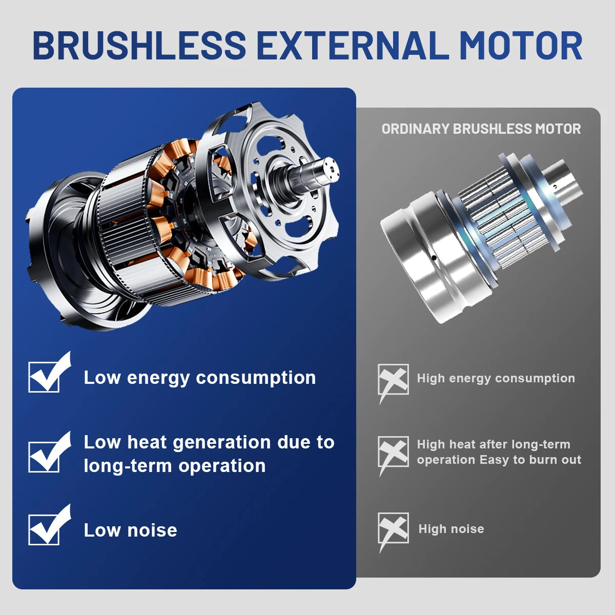 Brushless Motor: High-efficiency performance with reduced heat and longer lifespan.